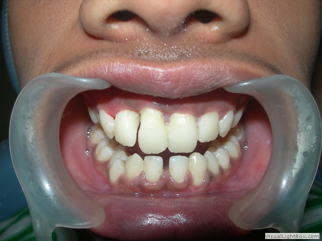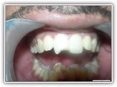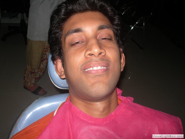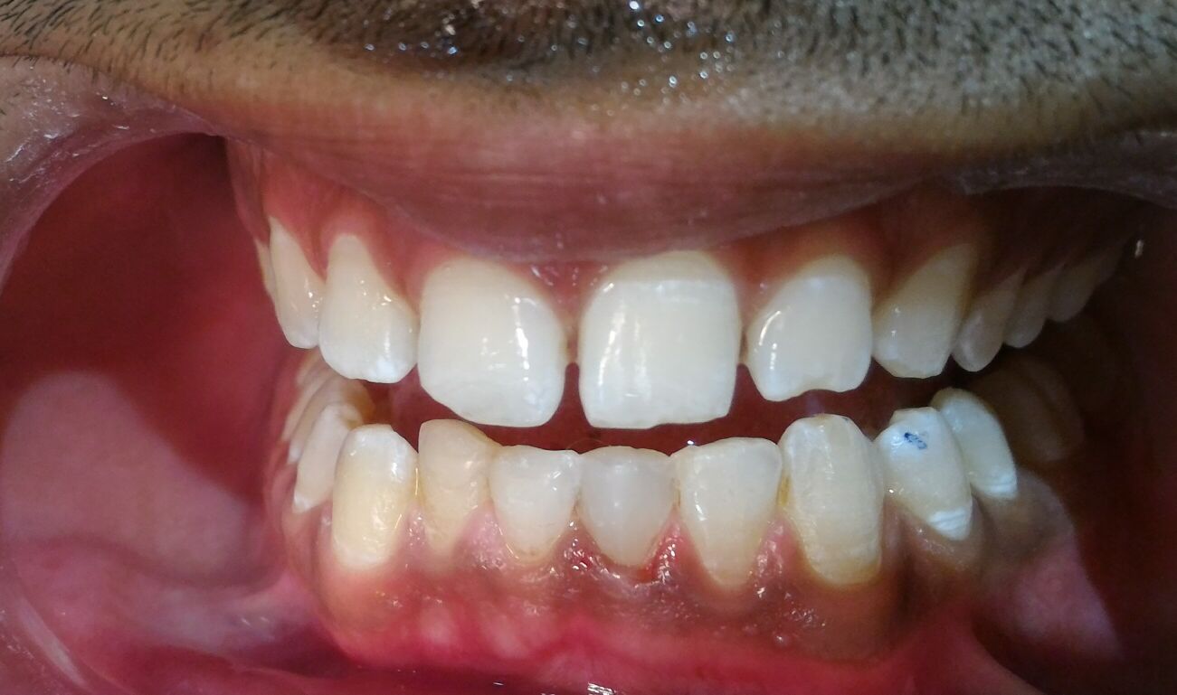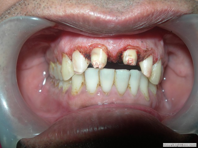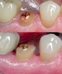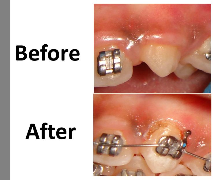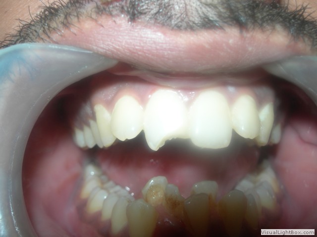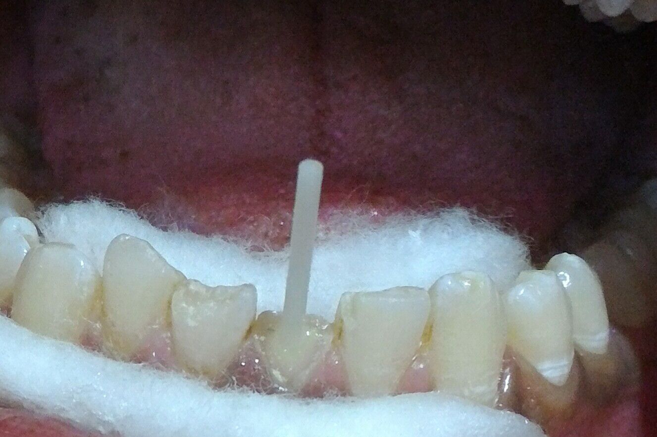 Broken front tooth treated with cosmetic restoration (Post core glass fiber placement inside the tooth for repair of fracture crown structure buildup)
